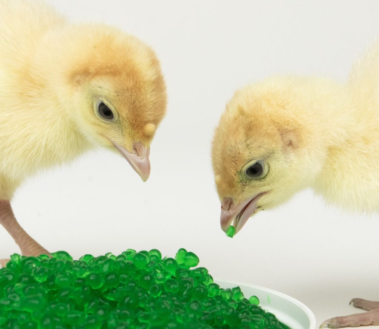 The brooding period of the chick and poult life cycle is critical to ensuring the genetic potential and productivity of poultry is ultimately achieved. For hatchlings to get a strong start, early access to feed and water at placement is needed to properly stimulate gastrointestinal and immune development, and promote overall health and livability. AquaBeads®, applied as a top-dressing on starter feed at placement, encourage strong feeding behavior while providing hydration.